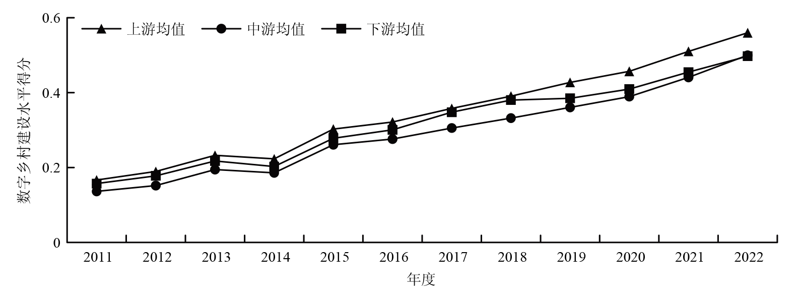 | 年份 | 综合得分 | 数字化基础 | 乡村农业数字化 | 乡村产业数字化 |
