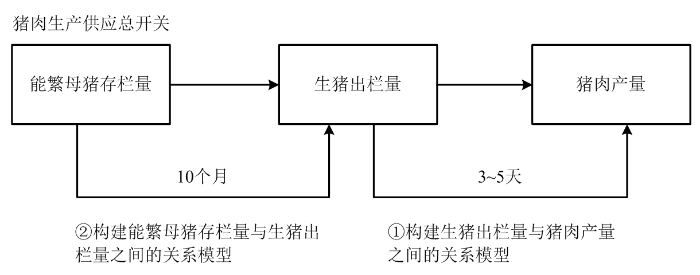 结合生猪生产的生物性周期和生产的连续性,生猪不同生长阶段之间存在一定的数量依赖关系。即猪肉供给量由本期生猪出栏量决定,生猪出栏量由前期生猪存栏量决定,生猪存栏量由前期能繁母猪存栏量决定,生长阶段转换关系见下图所示。那么,构建生猪出栏量、能繁母猪存栏量与猪肉产量三者之间的关系模型,实现按月份的中短期预测猪肉产量功能。